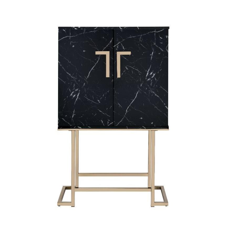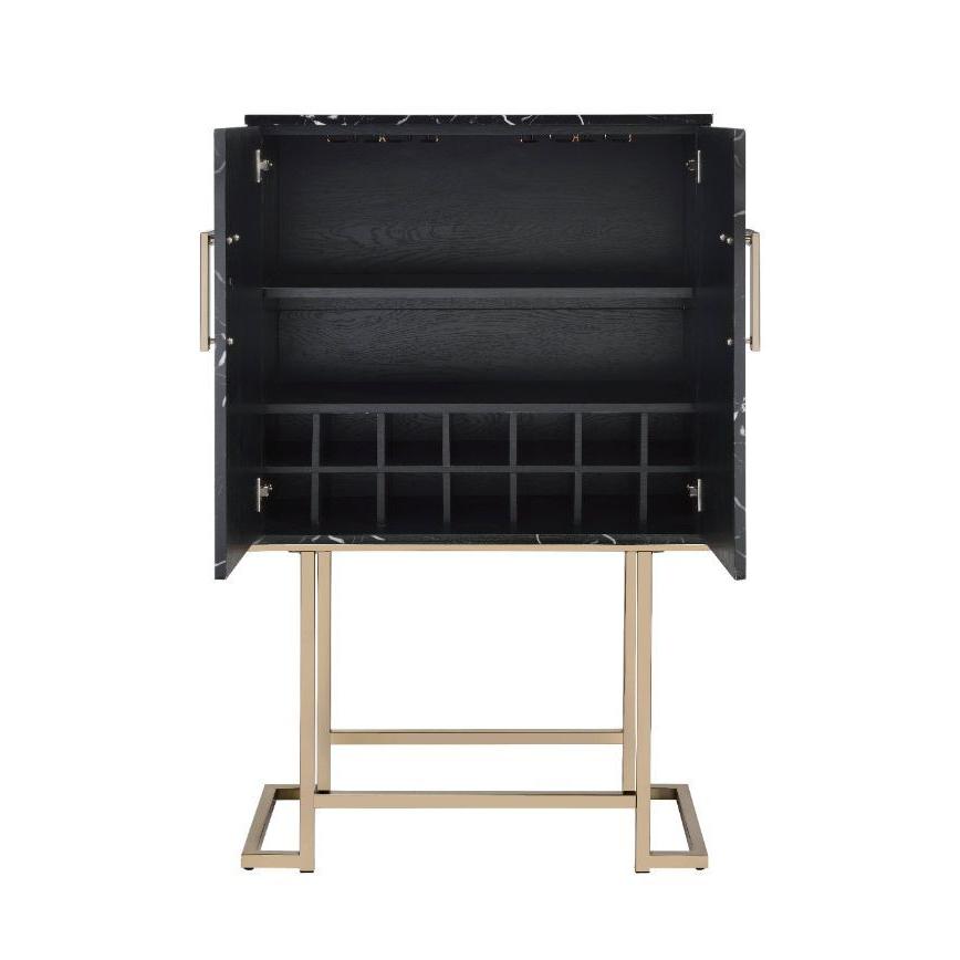 • Inside 2 open compartments: 1 wooden shelf, bottle wine rack for 14