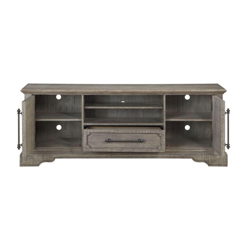 Rectangular TV Stand Storage: 2 Open Media Compartments (1 Wooden Shelf, Adjustable Positions), 2 Wooden Doors (1 Wooden Shelf, Adjustable Positions) Max Size Recommended: 75" Flat Panel TV CONSTRUCTION Wooden Case: Pine Wood Doors: Oversized Raised Scrolled Moldings (Poly Resin) Wooden Bracket Base Drawer: GLIDE Side Metal (3/4 Ext.), DOVETAIL French Front & English Back, FELT-LINED Drawer, SAFETY STOP Included, Self-Soft Closing, Hardware: Oversized Handle Cord Mgmt (Back Panel with Pre-Cut Holes)