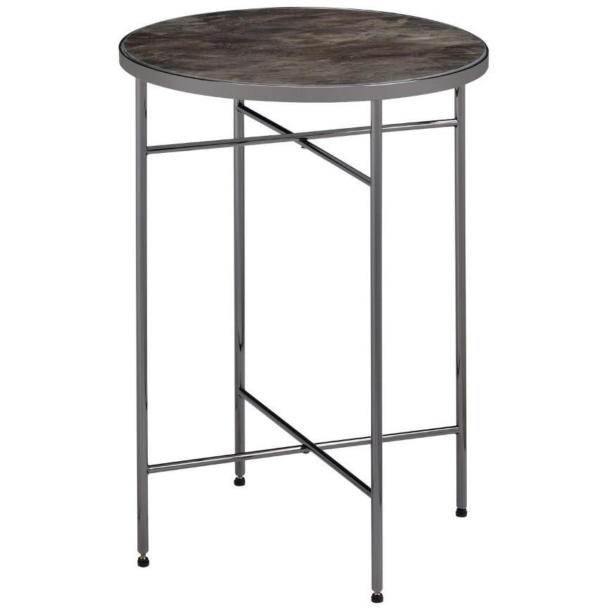 Round Side Table NO Storage Features: Marble Top, Metal "X" Shape Base (Open Base) CONSTRUCTION TOP) Marble: Top Size: 5mm Thick (NO Apron) BASE) Metal "X" Shape: Black Finish, Metal Tube