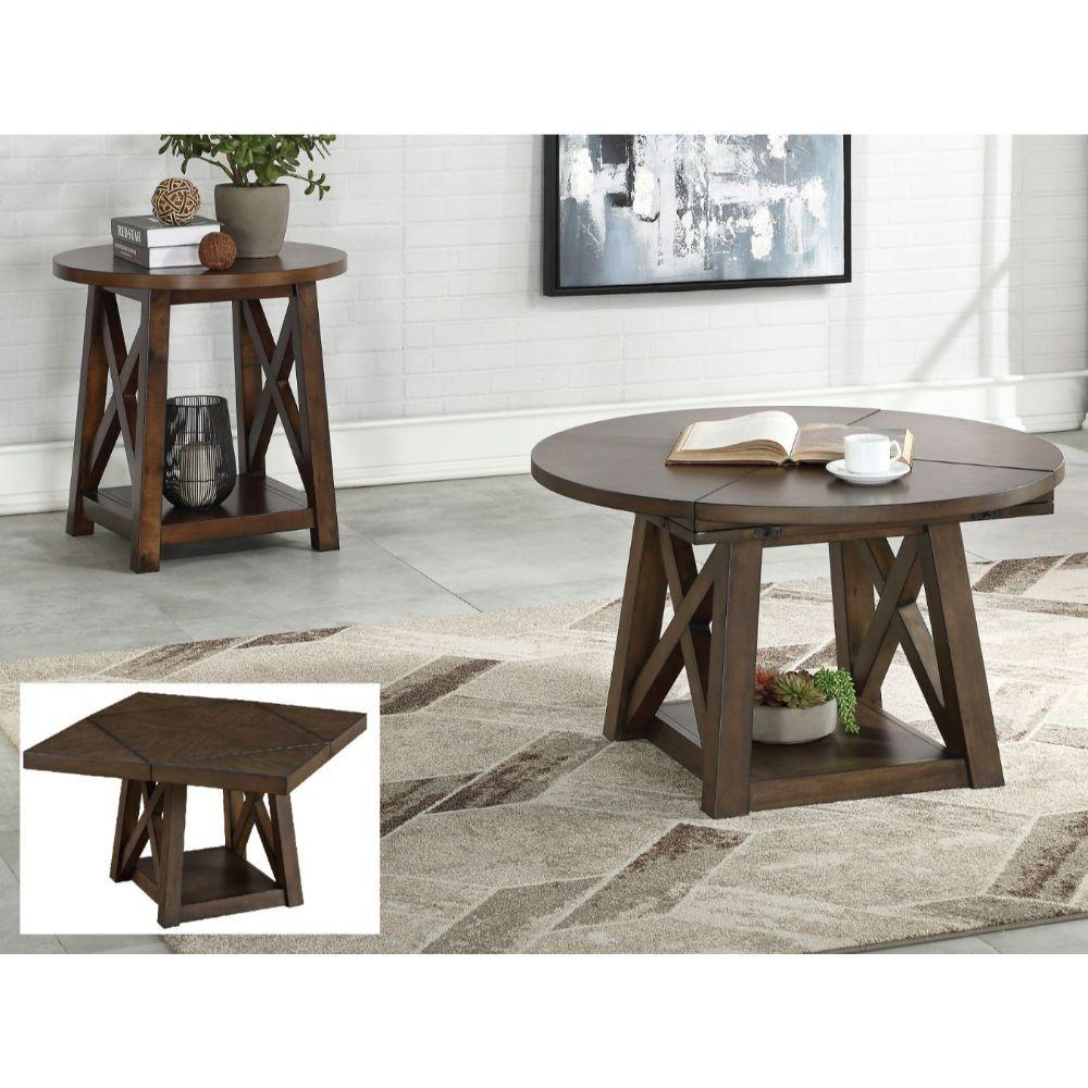 • Coffee table with convertible top (lift lid transforms from round into square shape)