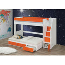KD, Twin Loft w/Storage Ladder (Top Loft Bed requires XL Twin Mattress) Slat System Included (13) RF Side Ladder/Opening (Built-In) Full Length Guard-Rail (Top Bed) Storage Ladder: 4 Wood Door Trundle & Desk Sold Separately Construction Solid Wood, Laminated Veneer, MDF (*) Q&A] Clearance between Floor & Top Bed: 79"L x 48"H (2000 x 1210mm) Maximum Mattress Height: 9" (Guardrail Height: 15"H) (376mm) Storage Ladder Compartment Size: 17" x 16" x 10"H, 25" x 16" x 10"H, 32" x 16" x 10"H, 39" x 16" x 10"H (Top to bottom 443 x 400 x 264mm, 623 x 400 x 264mm, 803 x 400 x 264mm, 983 x 400 x264mm)