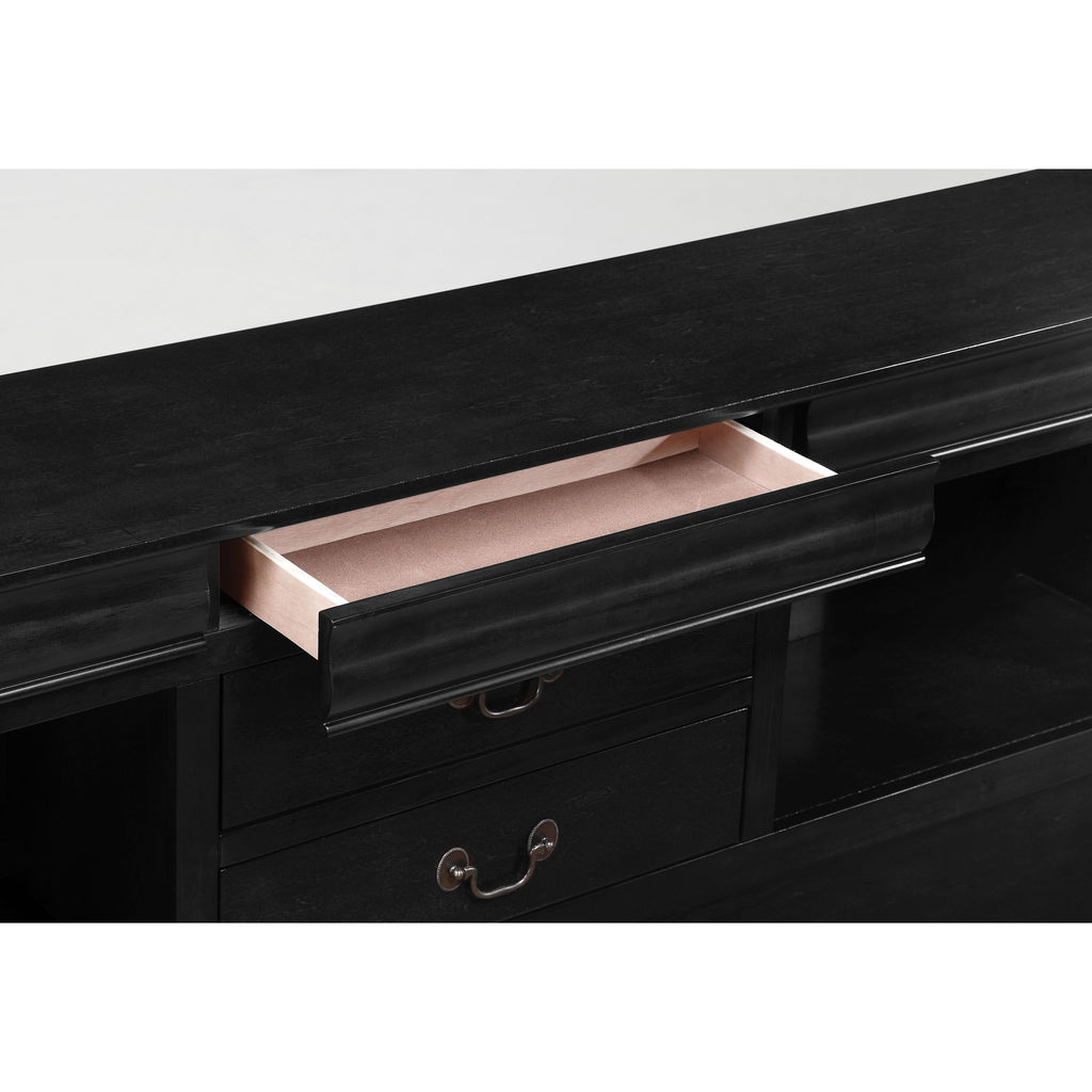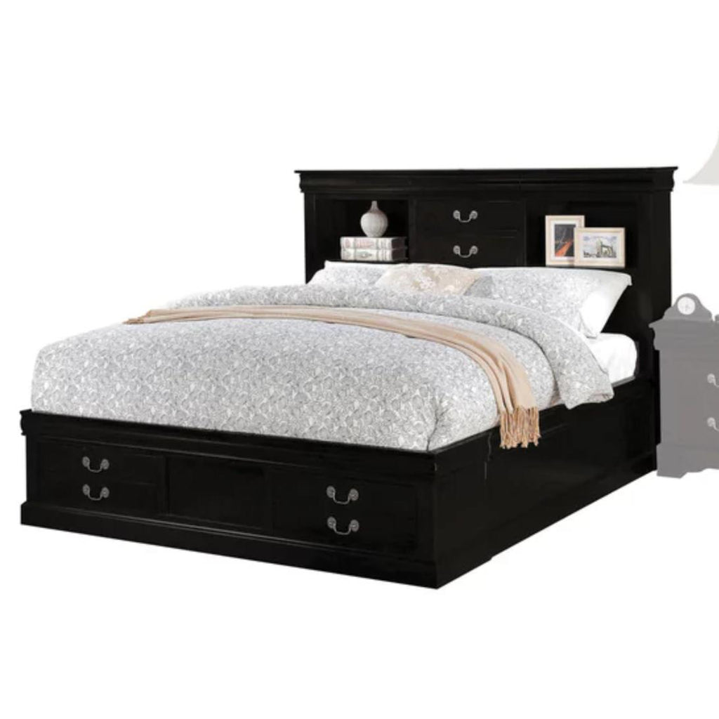 • Bookcase headboard with three hidden drawers, two center drawers and two open compartments