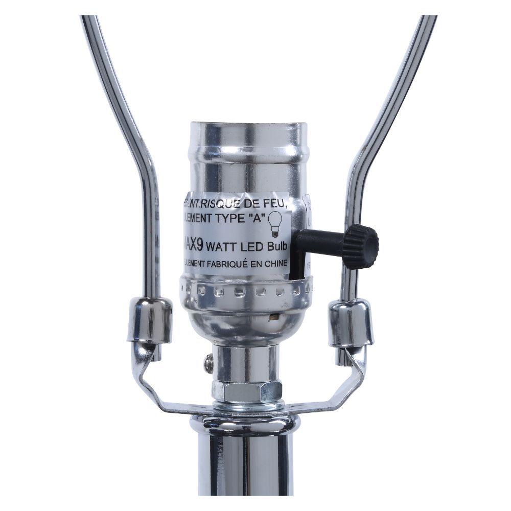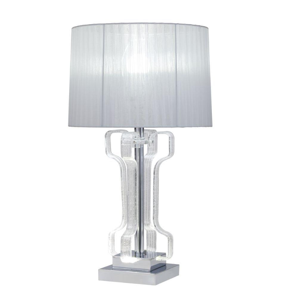KD, Table Lamp LED Night Light function, Sparkling Glow Base Light Bulb Required Type: 3PC G4, 1PC E26 LED (Included) Switch Type: Rotary Socket, ON-Off (Top) Drum Shade: White Silk Base Material: Clear Acrylic & Metal Base: Chrome Finish Wall Plug (Polarized 2-Prong Plug) [CL]