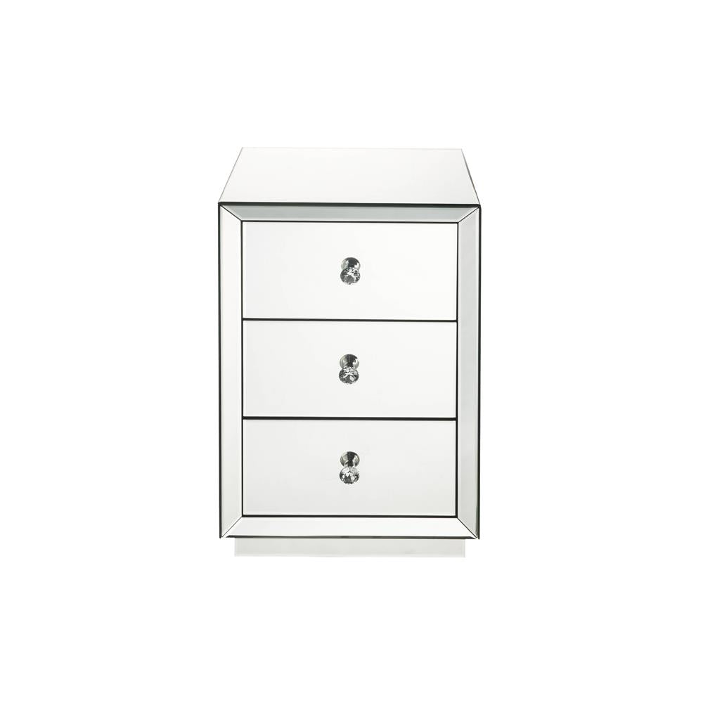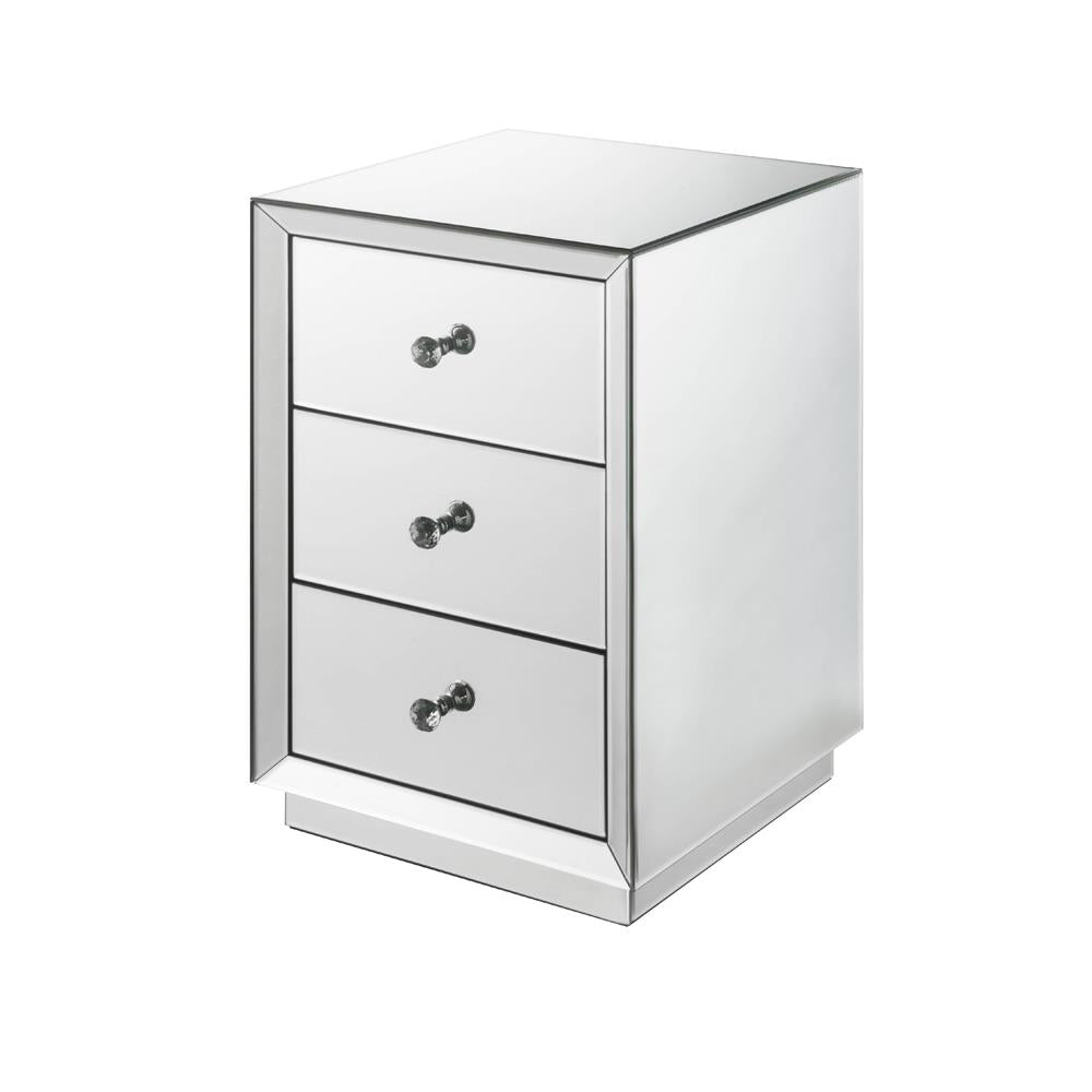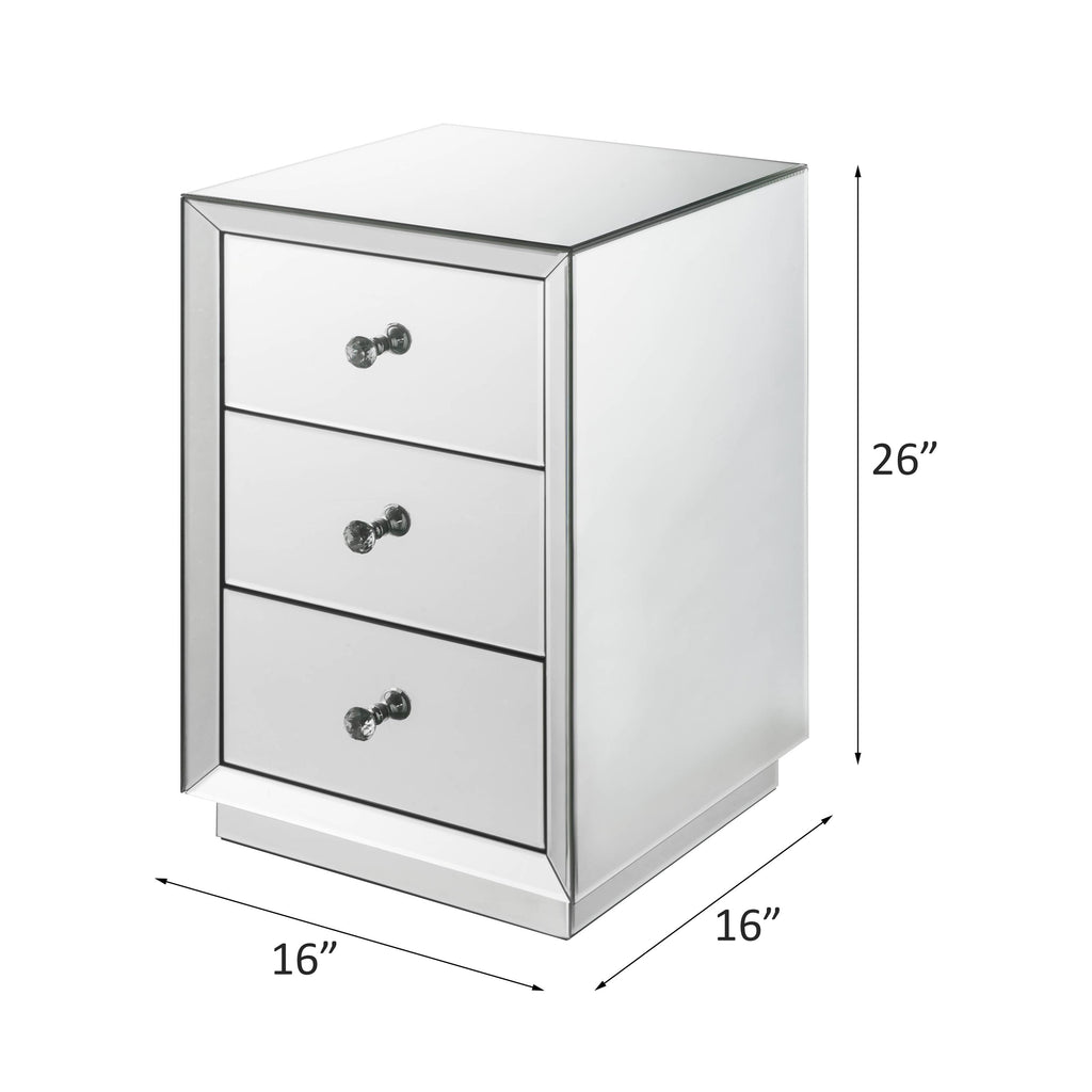 The Nyoka occasional table is perfect for your modern grace bedside. This dazzling table features a sturdy wood frame fully lined in beveled mirrors that will reflect light and your bold beauty. Its three drawers boast crystal knobs and are right size for keeping small items, remotes, or reading materials at your fingertips.