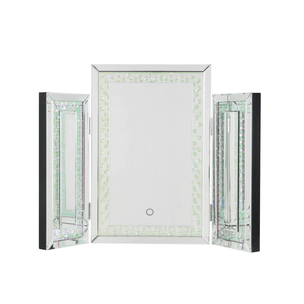 Display your dazzling sense of style by topping your vanity with the Nysa tri-fold mirror. This trifold mirror features a beveled mirrored frame with faux crystal inlay and LED lighting. Each piece is hinged, allowing you to adjust the position of the side panels.