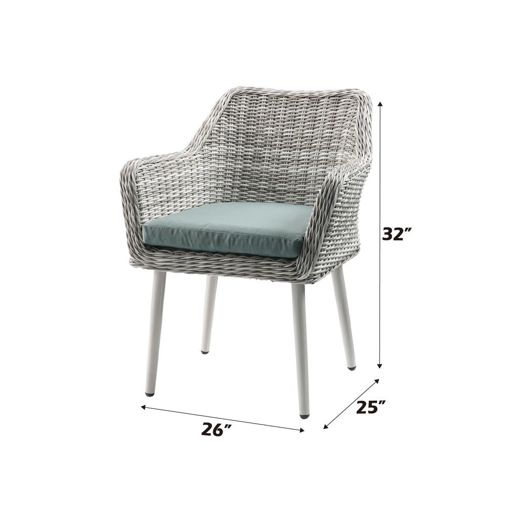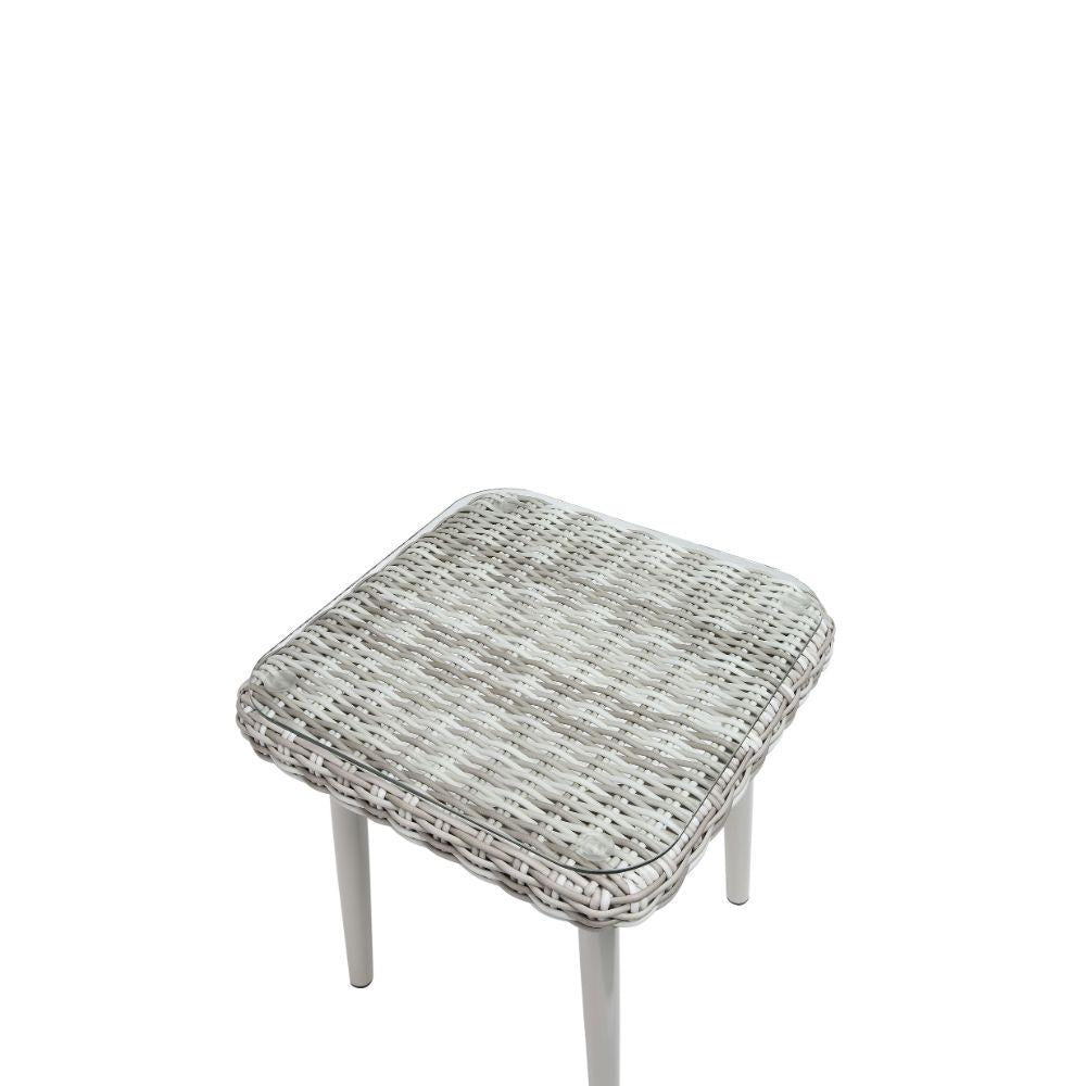 The Tashay 3Pc Patio Bistro Set by Acme Furniture features an aluminum structure, fabric cushions, and a beige wicker frame.