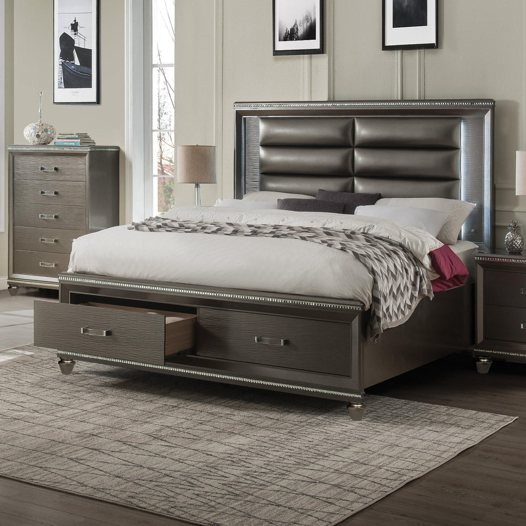 • Headboard: Padded, tufted, multi-tone fabric, LED lighting, sparkling mirror trim