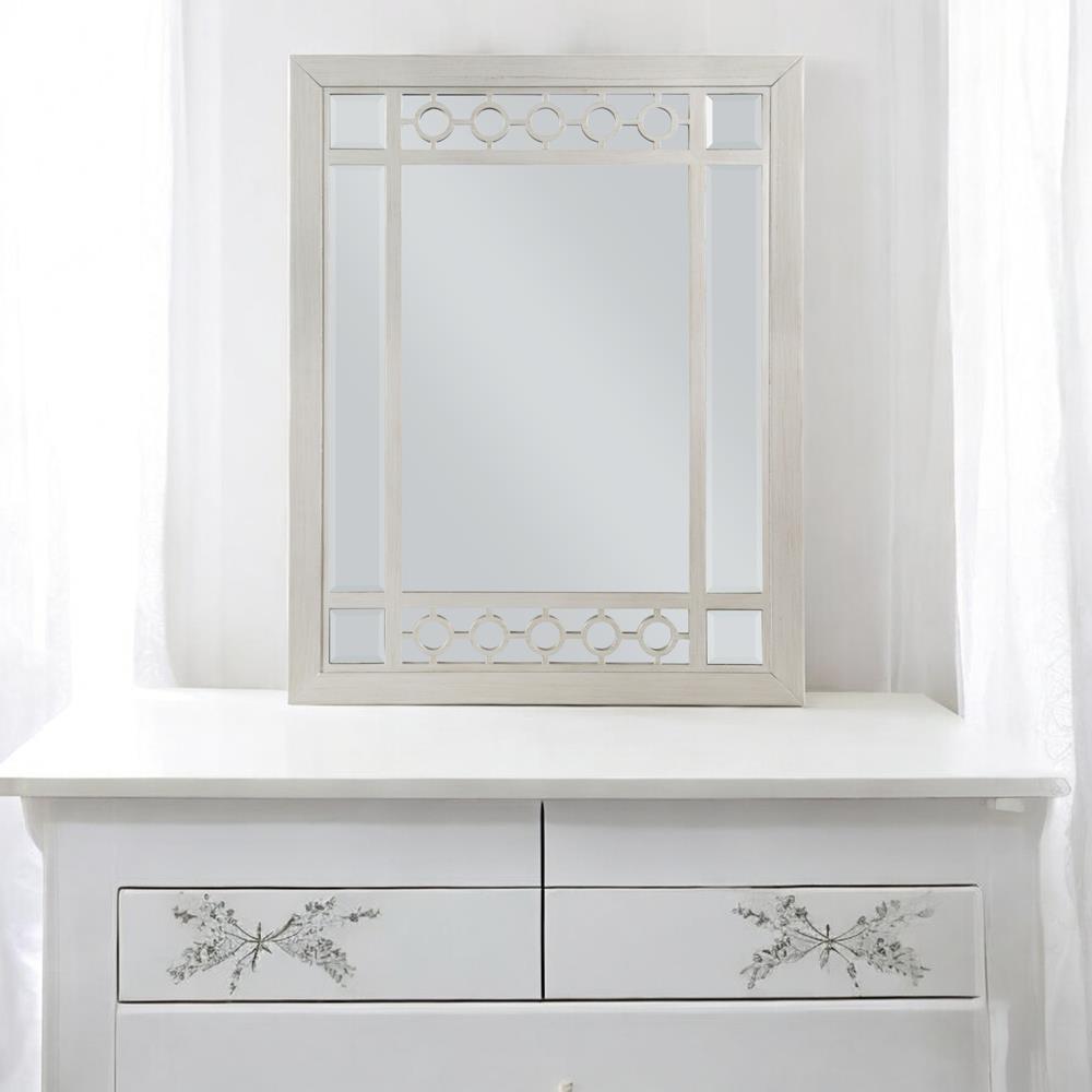 • Wooden Frame, Raised Geometric Trim, Beveled-Mirror Inlay