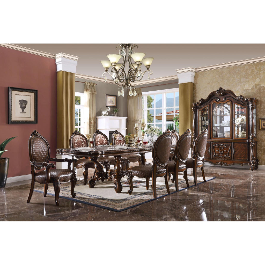 Irresistibly inviting, the Versailles collection displays the unrivaled beauty of the traditional dining. The dining table reflects highly decorative base... Irresistibly inviting, the Versailles collection displays the unrivaled beauty of the traditional dining. The dining table reflects highly decorative base with oversized scrolled feet, and the upholstered and tapestried chairs with deep button tufted and Nailhead trim accents add classic character and represents luxurious detailing. This collection offers three styles of tables and two finishes for you to choose, and it would be perfect for any formal dining room. View more
