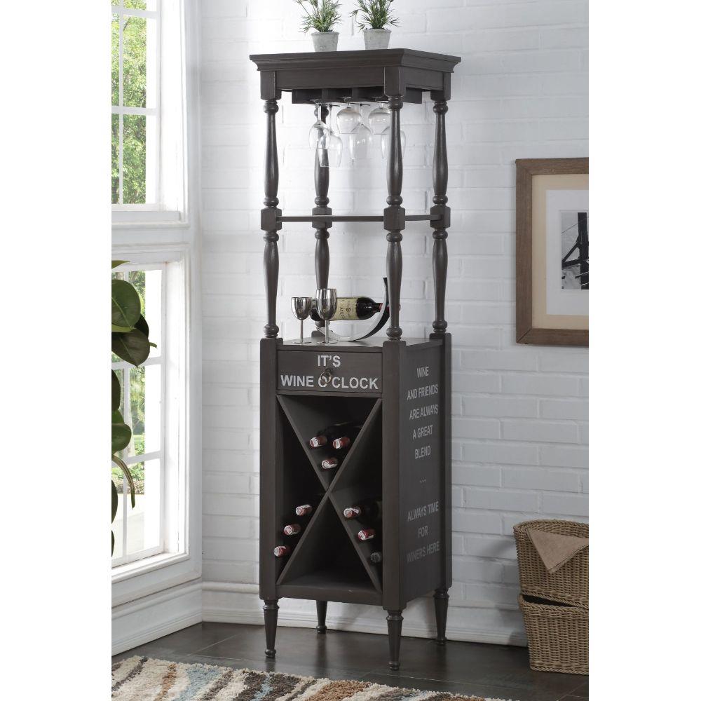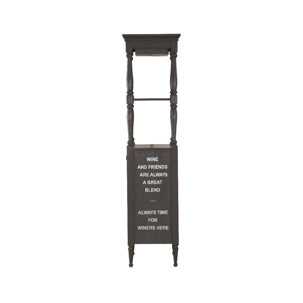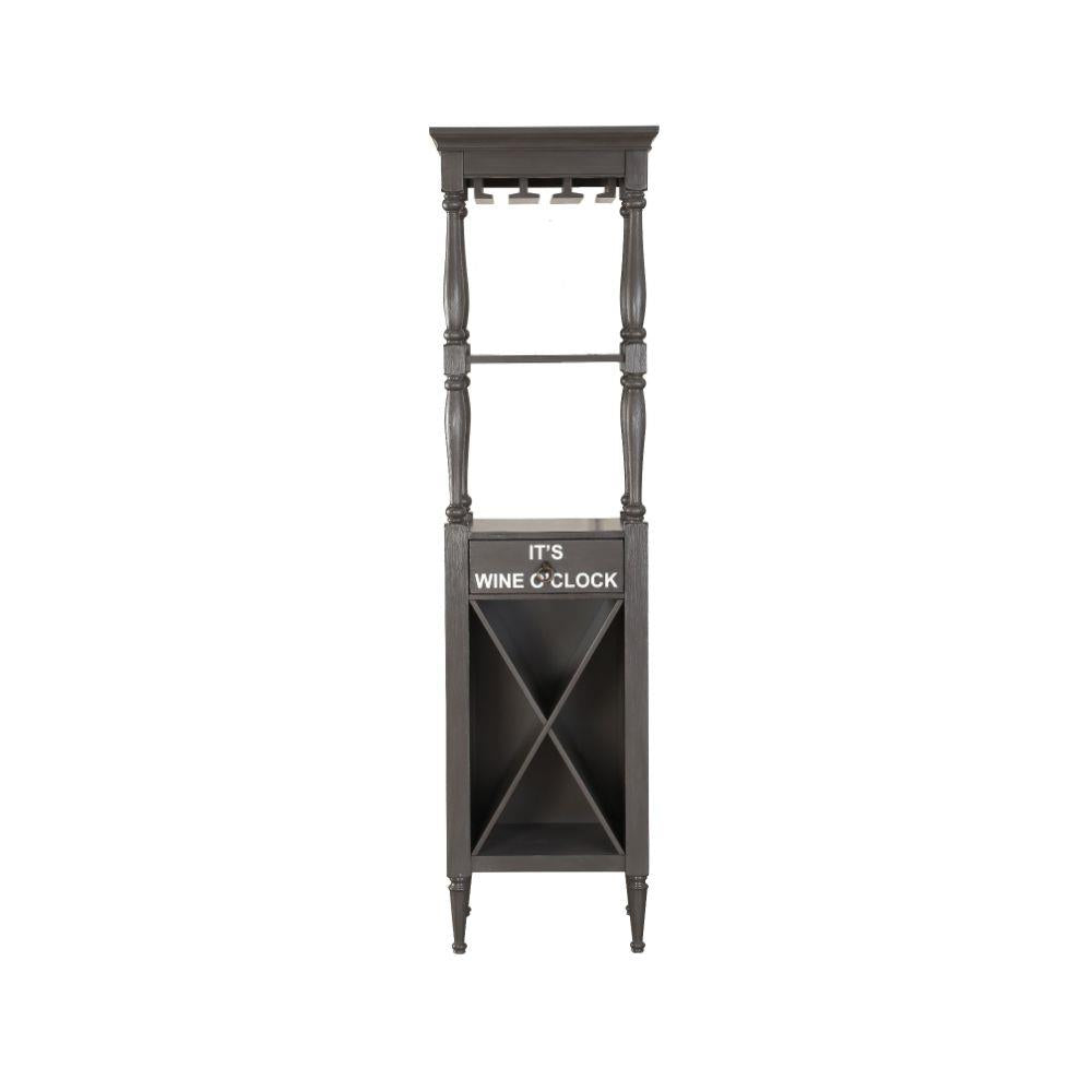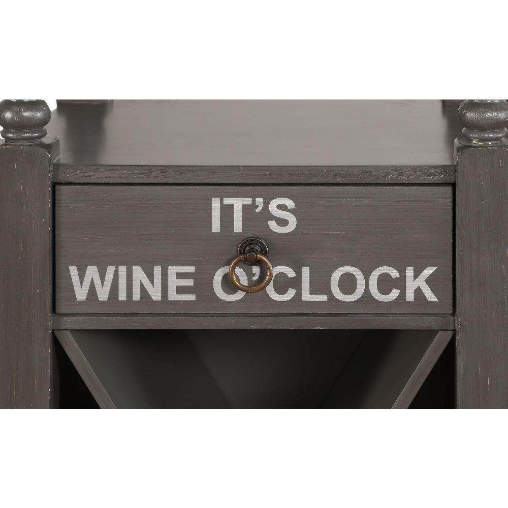 KD, Rectangular Wine Cabinet Storage Top: 2 Open Compartments, Stemware Rack, Storage Base: 1 Drawer & 4 Bottle Compartments Wooden Frame Drawer: Glide Metal (Full Ext), Normal Joinery (No DT/No Felt-Lined/No Self-Close/No Safety Stop) Text: It's Wine O-Clock, Wine and Friends are always a great blend, Always time for winners here