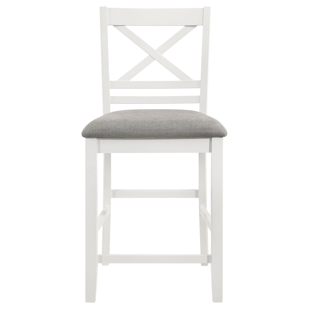 • Modern farmhouse charm in a set of two counter height dining chairs