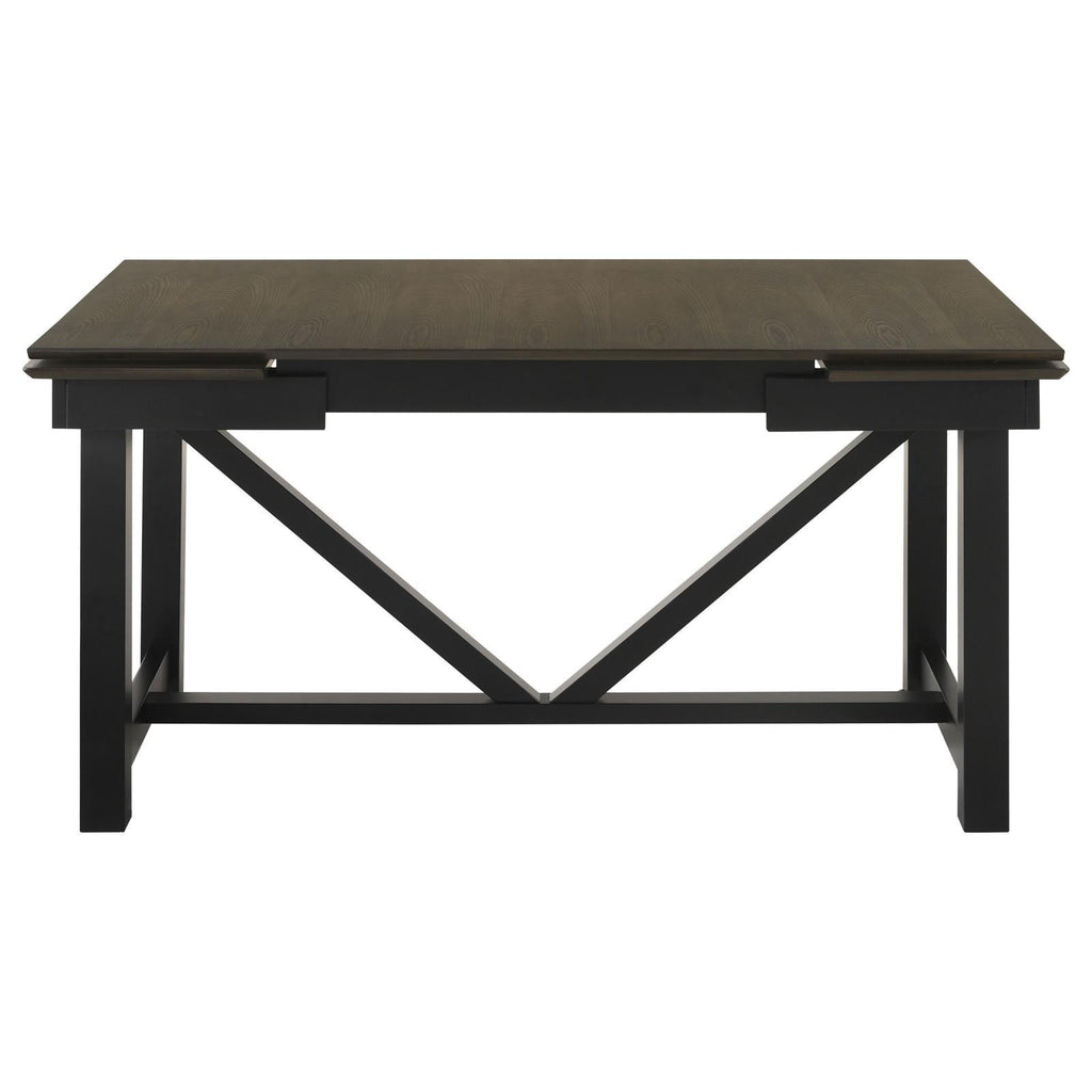 • The two-tone oak and black trestle base effortlessly enhance any décor, creating a stylish focal point