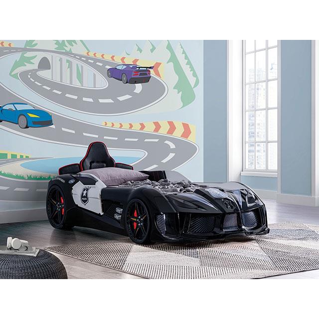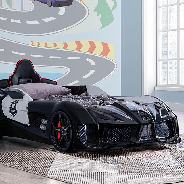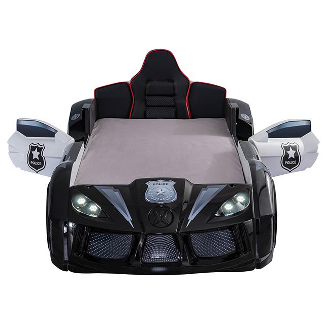 This is what dreams are made of! Create a fun-filled kids room with this sleek and comfy twin bed. A... This is what dreams are made of! Create a fun-filled kids room with this sleek and comfy twin bed. A stylish interpretation of the real patrol cars, it features magnetic doors that swing open and upholstered headboard shaped like a car seat. Use the included remote control to pick one of the four possible sound effects while you fill the room with ambient lighting from embedded LED lights in the wheels. Headlights serve as night lights for those intimate, bedtime stories. View more