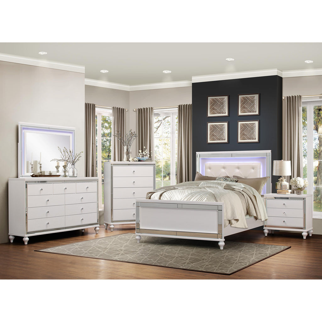 • Button-tufted faux leather upholstered headboard with LED lighting