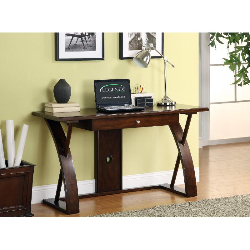 Cocoa finish; Constructed of hardwood solids and veneers; Single drop-front drawer for keyboard or writing material