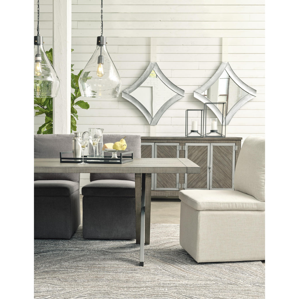 • Wood and metal base with weathered gray finish