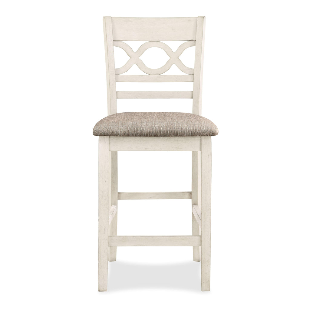 The Cori Counter Dining Set by New Classic Furnishings includes one round counter table and four counter stools. The table... The Cori Counter Dining Set by New Classic Furnishings includes one round counter table and four counter stools. The table comes in a two tone bisque and brown finish. The stool features a wood back and fabric upholstered seat. View more