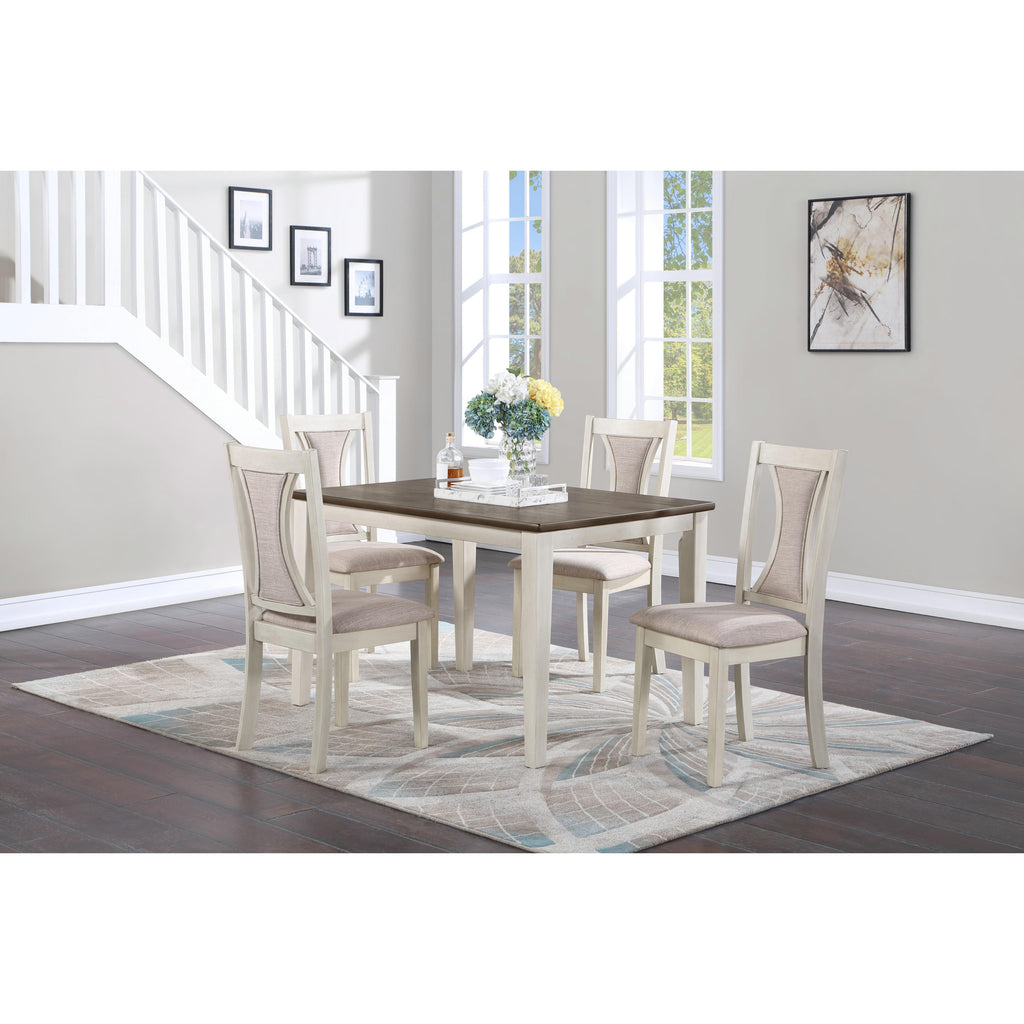 The Hudson Dining Set by New Classic Furnishings includes one rectangle dining table and four side chairs. It comes in a two tone brown and black finish. The chair features fabric upholstered back and seat.
