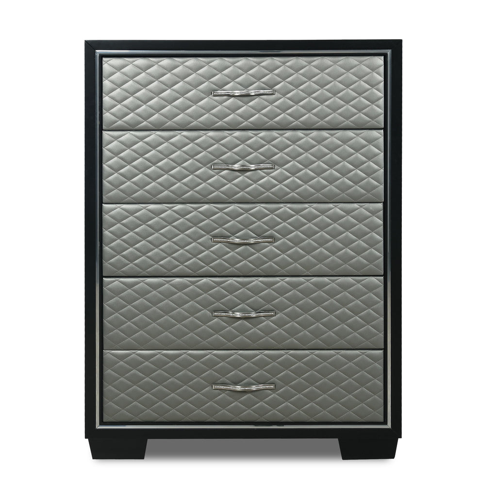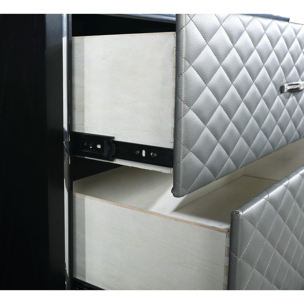 The Luxor Chest by New Classic Furniture will glam up your bedroom with the sleek and stylish. Upholstered fronts are... The Luxor Chest by New Classic Furniture will glam up your bedroom with the sleek and stylish. Upholstered fronts are enhanced with diamond stitching. Crafted of Birch and Poplar solids & oak veneers, the glossy black frames highlight the upholstered silver fronts. View more