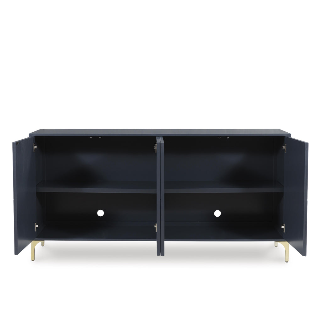 Elevate your aesthetic with the chic design of this accent cabinet. Sleek goldtone legs and striking doors with a geometric... Elevate your aesthetic with the chic design of this accent cabinet. Sleek goldtone legs and striking doors with a geometric pattern infuse contemporary flair wherever you place this piece. Add a dark blue finish, and you've got a stunning showstopper. Providing function to form, the cabinet's push magnetic doors reveal two shelves and openings for electronics. View more