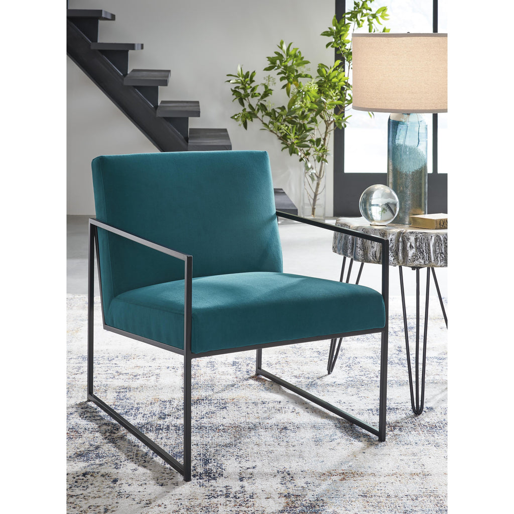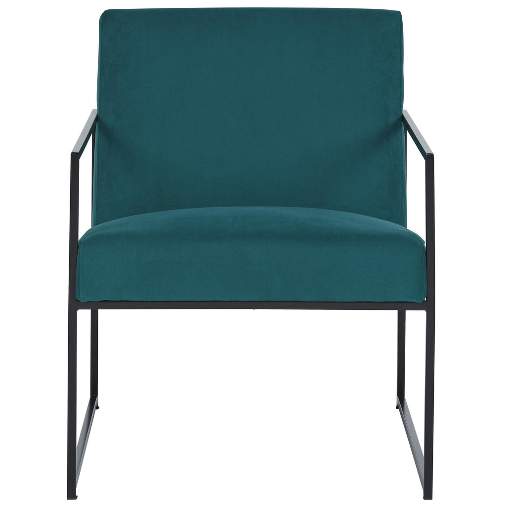 Dress up your reading nook or den with the decidedly contemporary stylings of this accent chair. Velvet fabric in a... Dress up your reading nook or den with the decidedly contemporary stylings of this accent chair. Velvet fabric in a teal tone provides a pop of soft color while remaining reserved and refined in appearance. A streamlined metal frame polishes off the posh design. View more