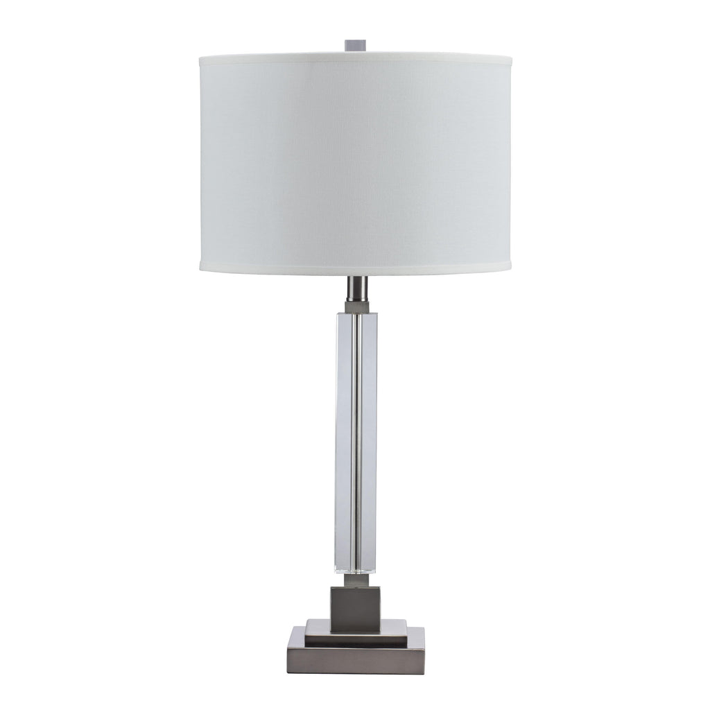• Made of crystal and metal with drum hardback fabric shade