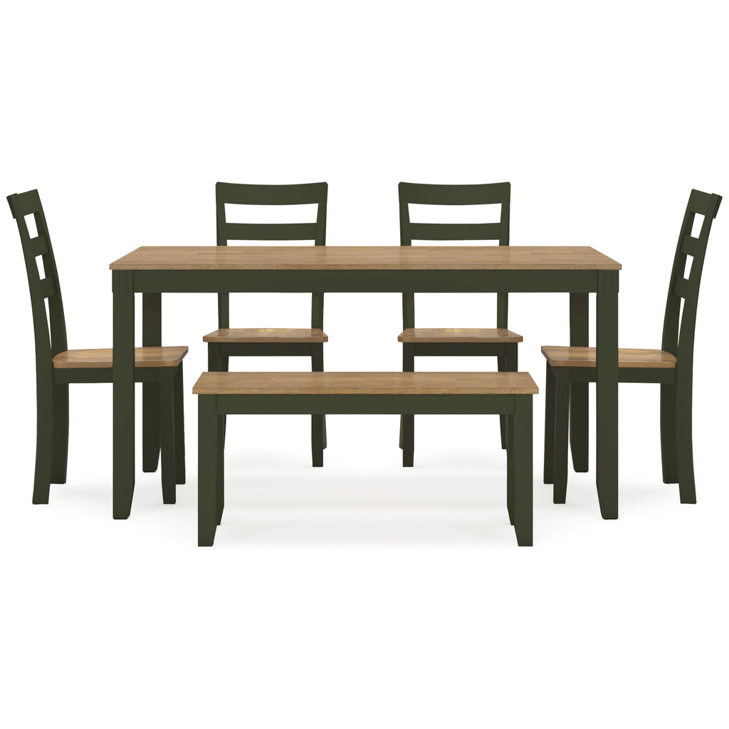 • Includes dining table, bench and 4 chairs