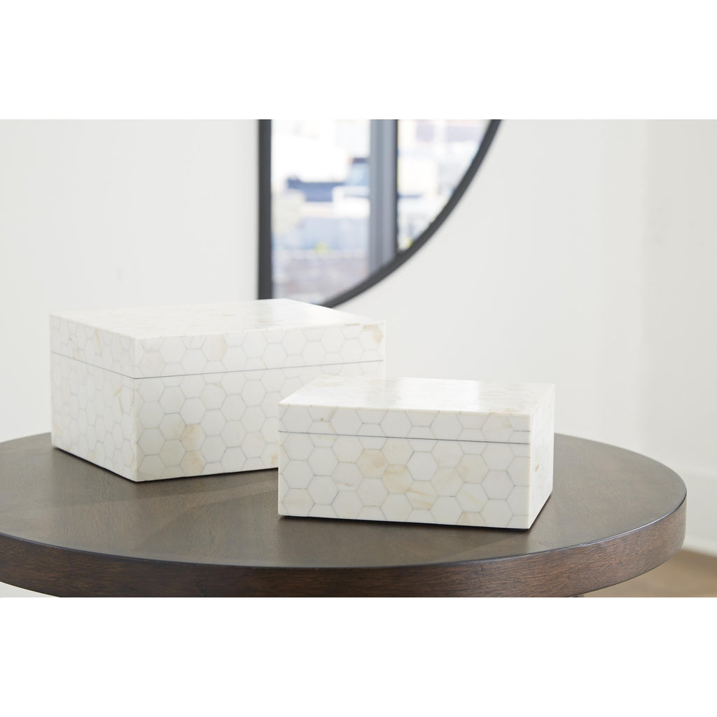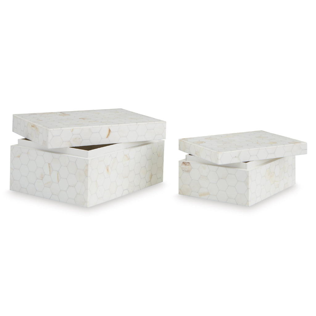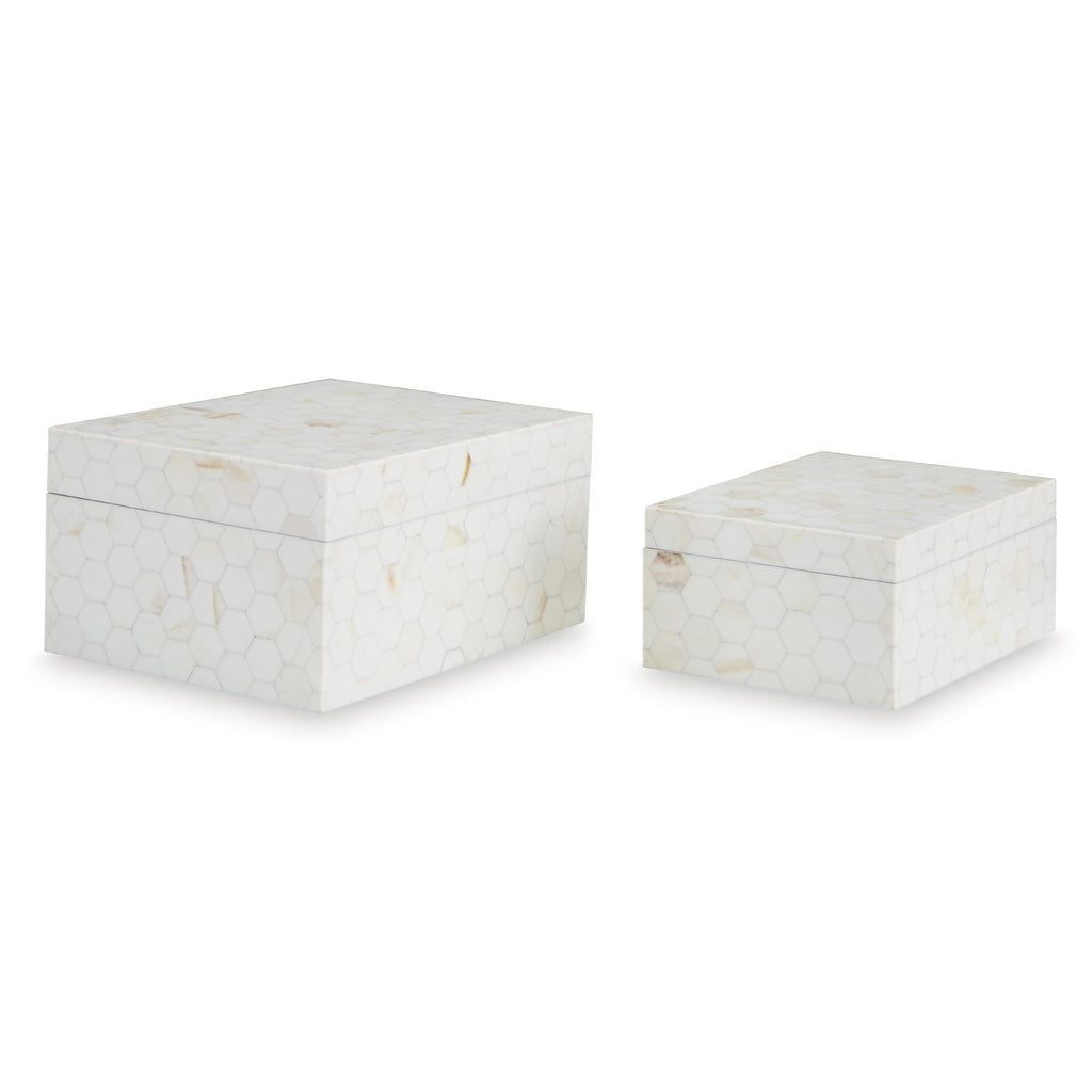 Looking for a casually cool home accent? This set of boxes stacks up beautifully. A hexagonal mosaic design and cream... Looking for a casually cool home accent? This set of boxes stacks up beautifully. A hexagonal mosaic design and cream finish bring a laid-back element to your decor. What a stylishly effortless way to refresh your shelves and tabletops. View more