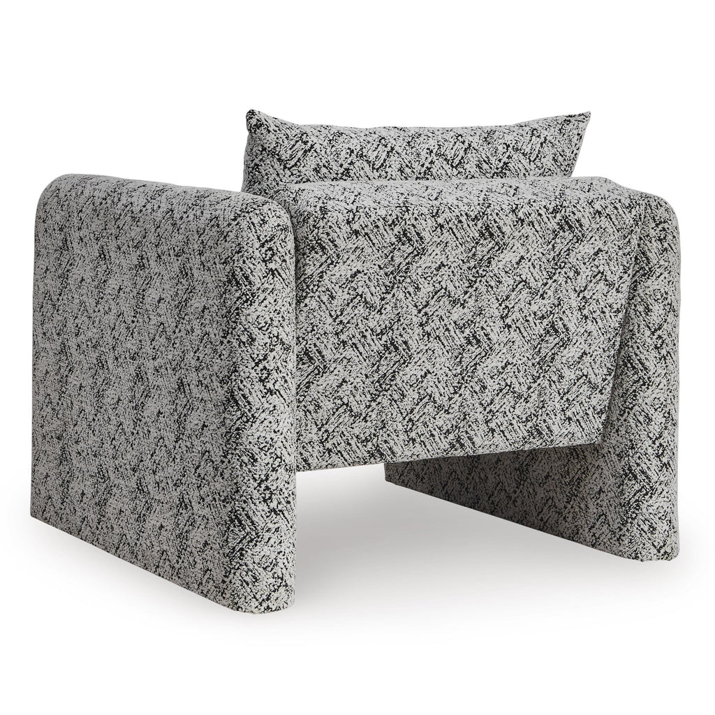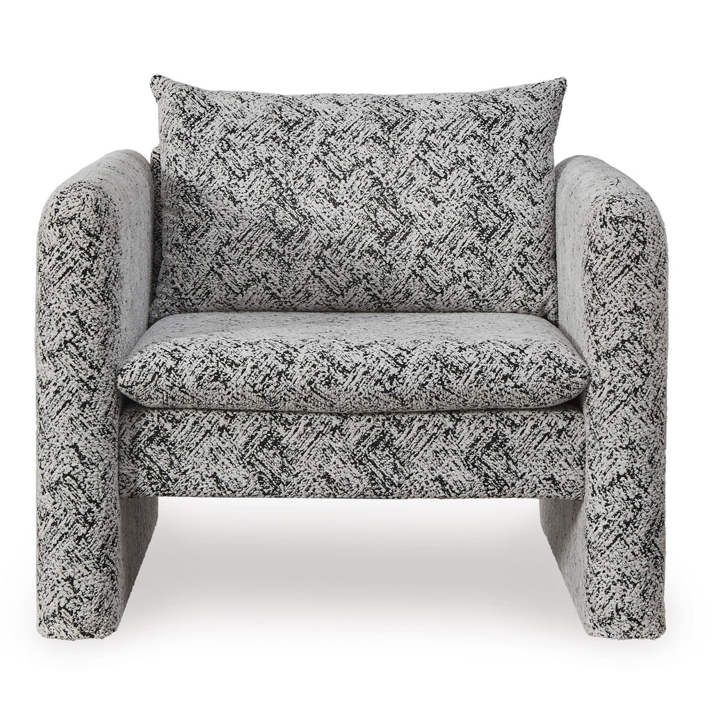 This fashion-forward accent chair keeps comfort and contemporary style at top of mind. Its eye-catching black and white geometric pattern... This fashion-forward accent chair keeps comfort and contemporary style at top of mind. Its eye-catching black and white geometric pattern makes a bold statement while remaining versatile enough to pair with other neutrals or pops of color. A low-profile back and streamlined silhouette lend a sophisticated, trend-right vibe to your space. View more