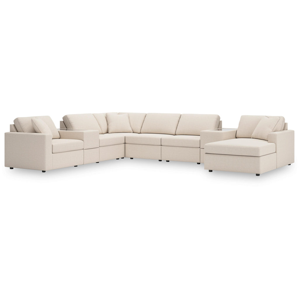 • Includes 8 modular pieces: left-arm facing corner chair, 3 armless chairs, 2 consoles with storage, wedge and right-arm facing corner chaise