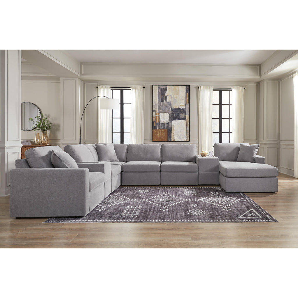 • Includes 8 modular pieces: left-arm facing corner chair, 2 consoles with storage, 3 armless chairs, wedge and right-arm facing corner chaise